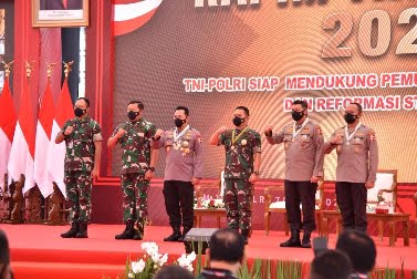Rapim yang mengusung tema “TNI – Polri Siap Mendukung Pemulihan Ekonomi Nasional dan Reformasi Struktural”, ini diikuti 394 orang yang terdiri dari 168 orang hadir tatap muka sedangkan sisanya 226 orang mengikuti melalui video conference (Vicon) di 43 lokasi seluruh Indonesia.
